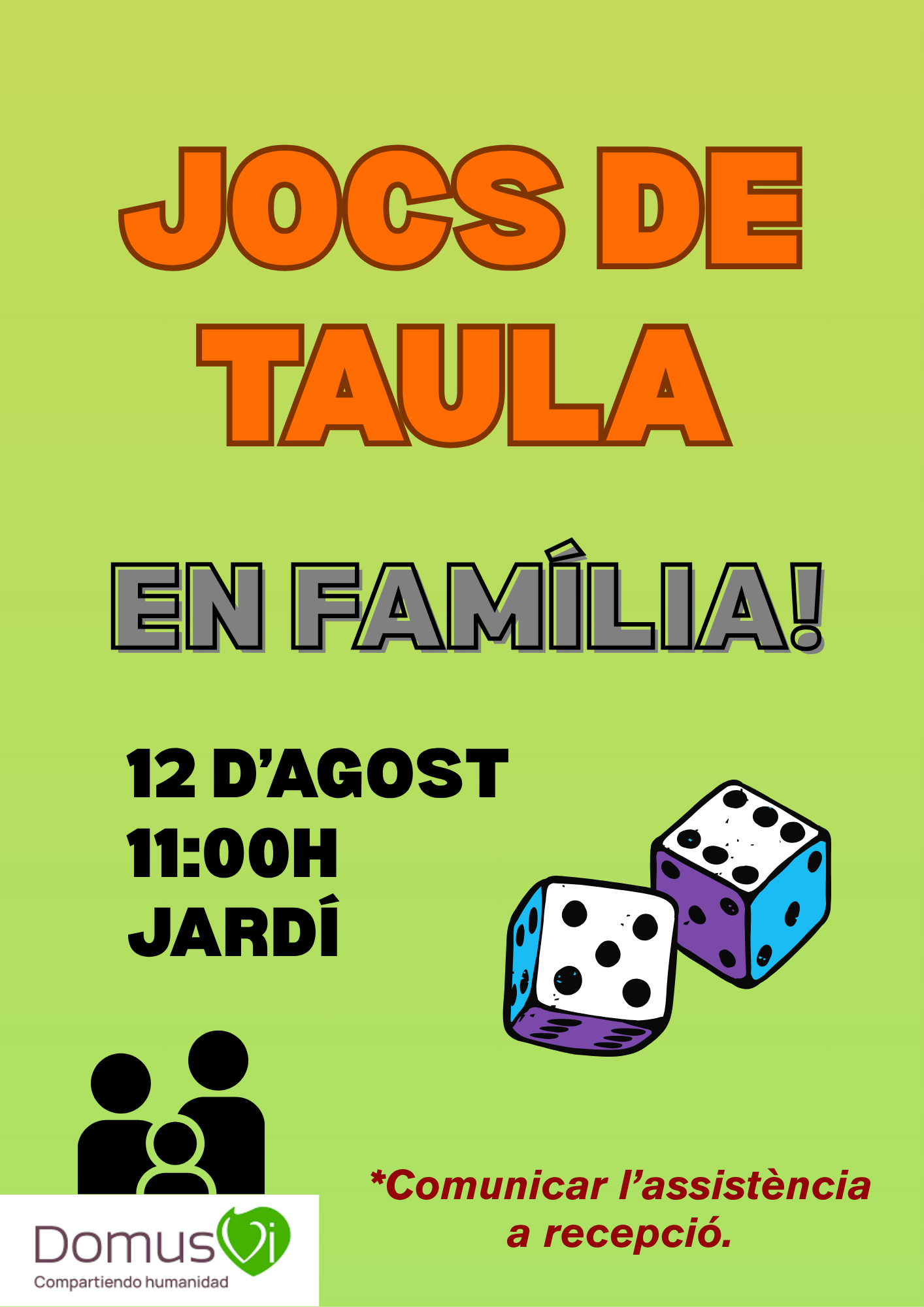 El pròxim dimarts dia 12 podrem gaudir d'un matí de jocs de taula a la fresca en família! Per això us convoquem a les 11h del matí al jardí. Us hi esperem!